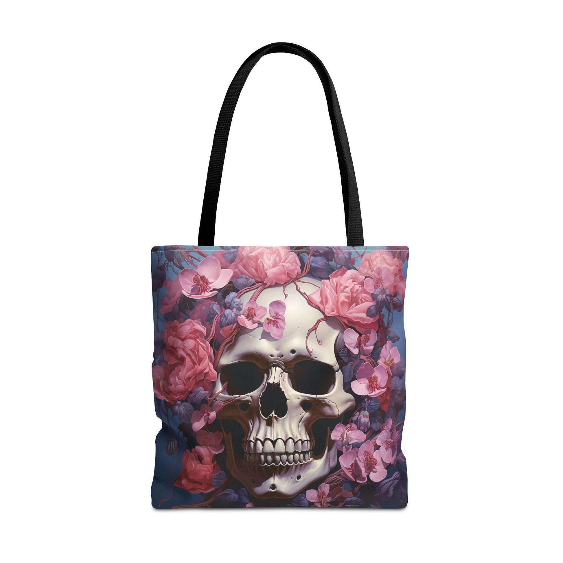 A bold, artful tote that blends dark romance with everyday function. A detailed skull sits at the center, softened by a halo of blooming pink roses and petals—moody, poetic, and unapologetically cinematic. The all-over print wraps the bag in rich contrast: deep, shadowed blues behind the ivory skull and vivid rose tones that catch the eye. Durable polyester holds the shape and color wash after wash, while boxed corners and reinforced handles give real carrying strength. Carry it to markets, classes, or late-night strolls and let the imagery speak: equal parts edgy and tender, this tote moves with someone who loves statement style and practical design.